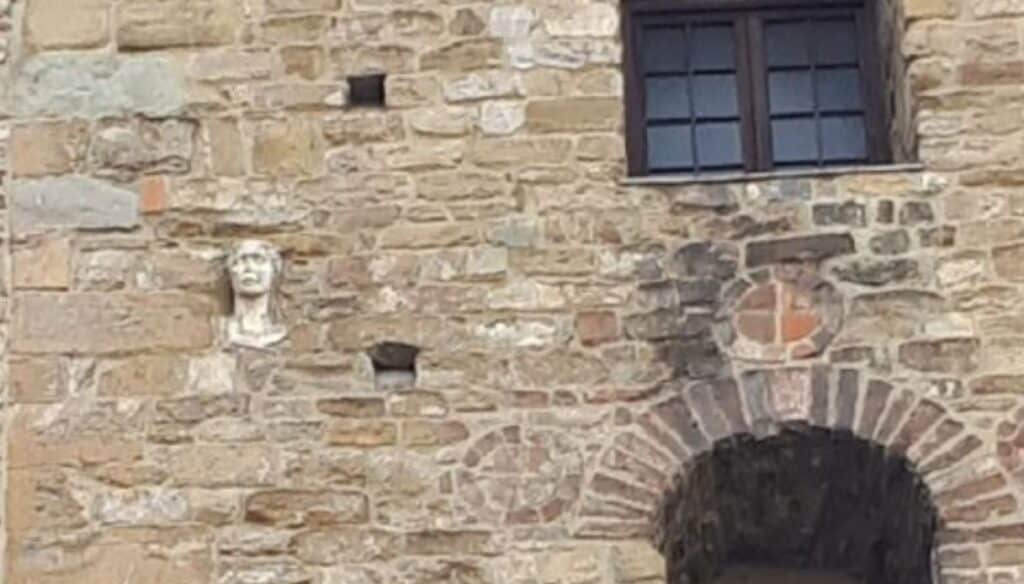 This is the so-called Berta’s head, a stone face walled into the exterior of the building. Various stories have sprung up around this figure, and this interweaving of versions is part of its charm. In one of the best-known, Berta is a woman who remained petrified after witnessing an exceptional event without showing any reaction. In other versions, however, the face is linked to various episodes, always with a hint of condemnation or a disturbing presence.