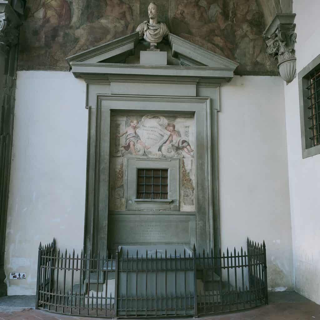 Il portico esterno, opera brunelleschiana, ha una lunghezza di 71m ed è realizzato con pietra serena su intonaco bianco, secondo lo stile di Brunelleschi e, più in generale, rinascimentale. Sotto il portico sono visibili affreschi e busti marmorei dei Granduchi Cosimo I, Francesco e Ferdinando dei Medici.