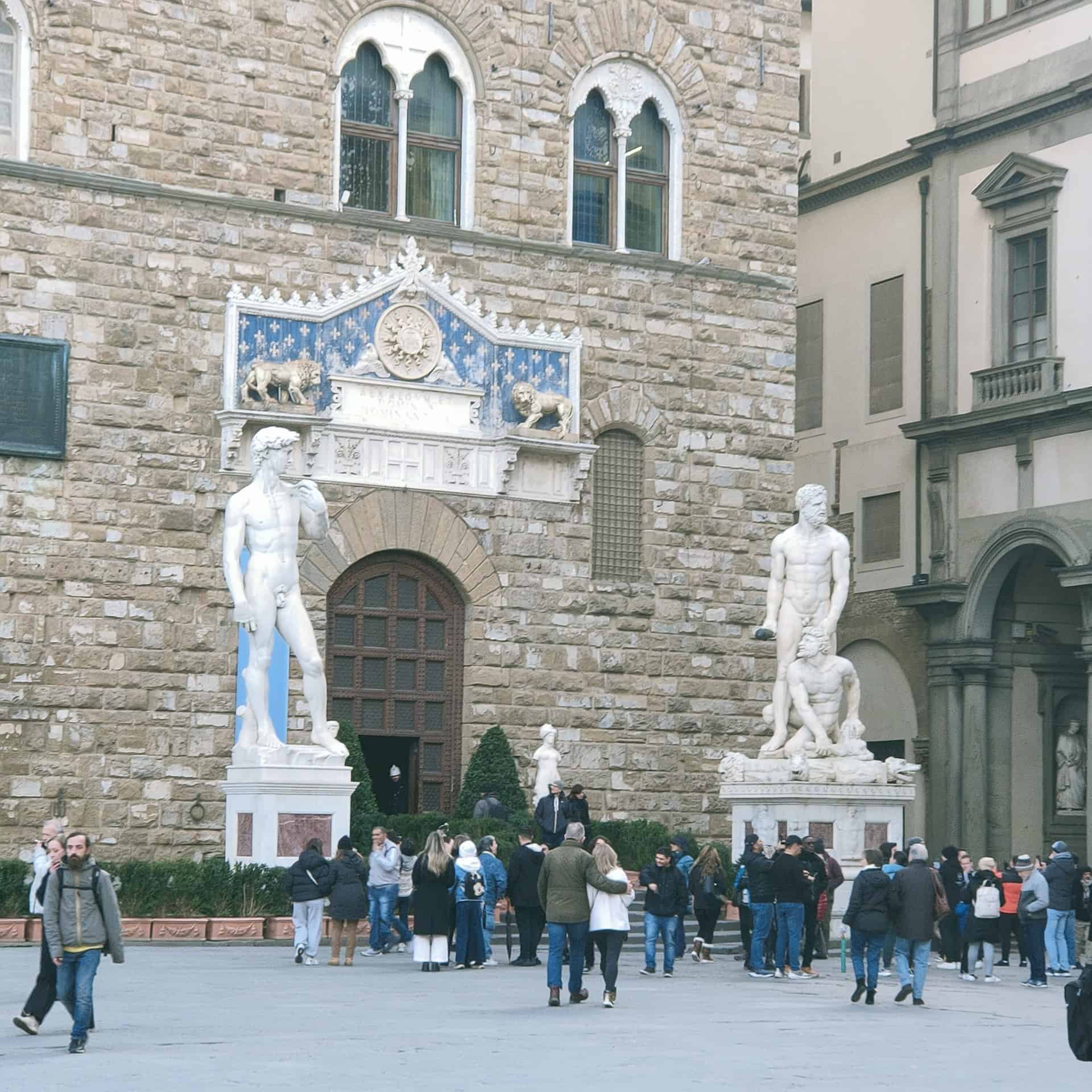 Collocate davanti la facciata ci sono le copie di opere prestigiosi, quali il Marzocco e la Giuditta e Oloferne di Donatello, il David di Michelangelo, Ercole e Caco di Baccio Bandinelli, autore molto contestato per aver osato accostare la sua opera al capolavoro di Michelangelo.